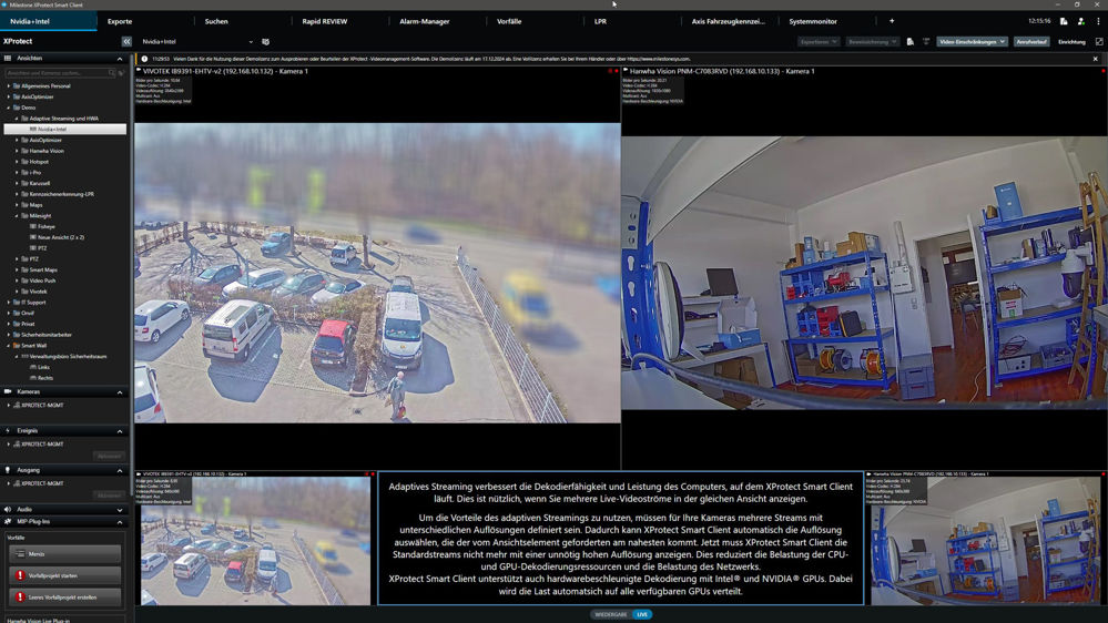 XProtect Smart Client unterstützt hardwarebeschleunigte Dekodierung mit Intel® (links, Vivotek Kamera) und NVIDIA® GPUs (rechts, Hanwha Kamera) gleichzeitig und verteilt die Last automatisch auf alle verfügbaren GPUs auf dem Client-Rechner.