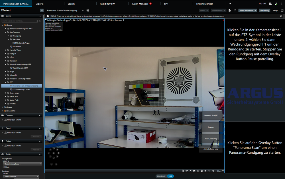 Pan-tilt-zoom (PTZ) control is an essential feature within the Milestone XProtect video management system that allows users to adjust the orientation and zoom of their surveillance cameras in real time. This feature provides flexible surveillance by enabling users to view specific areas in more detail or get a broader overview of a particular area. The integration of PTZ control in Milestone XProtect allows users to control the camera both manually and through predefined settings (such as patrols, panoramic scan or guard tours), enabling efficient monitoring of large or complex areas with minimal manpower. XProtect's user interface is intuitively designed so that even people without in-depth technical knowledge can easily use the PTZ functions. In addition, Milestone XProtect supports a wide range of camera models and manufacturers, ensuring high compatibility and flexibility in existing surveillance systems.